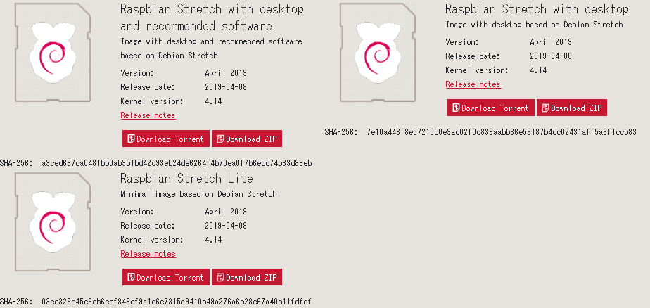 Raspbianは3種類ある。目的によって最適なのを選びましょう。なお現在の最新バージョンは9(Stretch)。